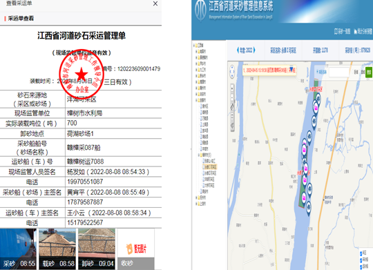 二,2019年10月,宜春市水利局率先在樟樹實施電子化采運單試點,形成河道砂石開采、運輸、銷售的全程監控一體化 “電子采運管理單”,并于2020年1月份開始試運行,2021年2月正式運行。“現在通過電子化采運單,采砂辦能更準確地掌握每輛采運砂船的采運數據和具體位置,更有針對性地管理開采活動。同時,電子采運單的推行也保障了采運砂數據的真實性和可信性,大幅提高了采砂管理效率。”樟樹市采砂辦主任彭小如說。
