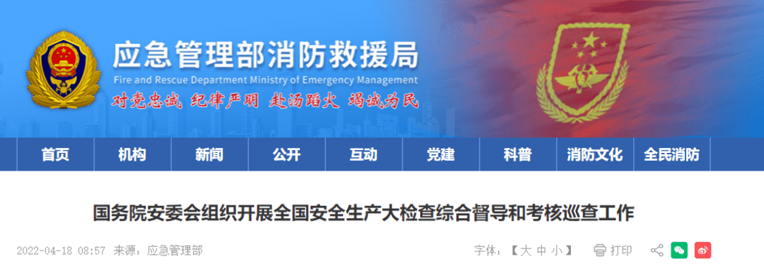 根據(jù)黨中央、國務(wù)院決策部署和全國安全生產(chǎn)大檢查工作安排,自4月中旬至6月底,國務(wù)院安委會組織16個綜合檢查組,對31個省(自治區(qū)、直轄市)和新疆生產(chǎn)建設(shè)兵團安全生產(chǎn)大檢查情況進行綜合督導(dǎo),并同步開展國務(wù)院2021年度省級政府安全生產(chǎn)和消防工作考核巡查及國務(wù)院安委會成員單位安全生產(chǎn)工作考核。